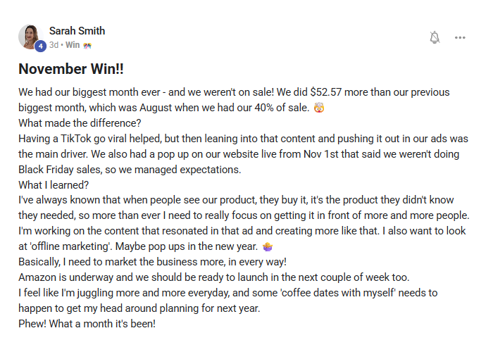 - A community of like-minded business owners to bounce ideas off and share wins and challenges.